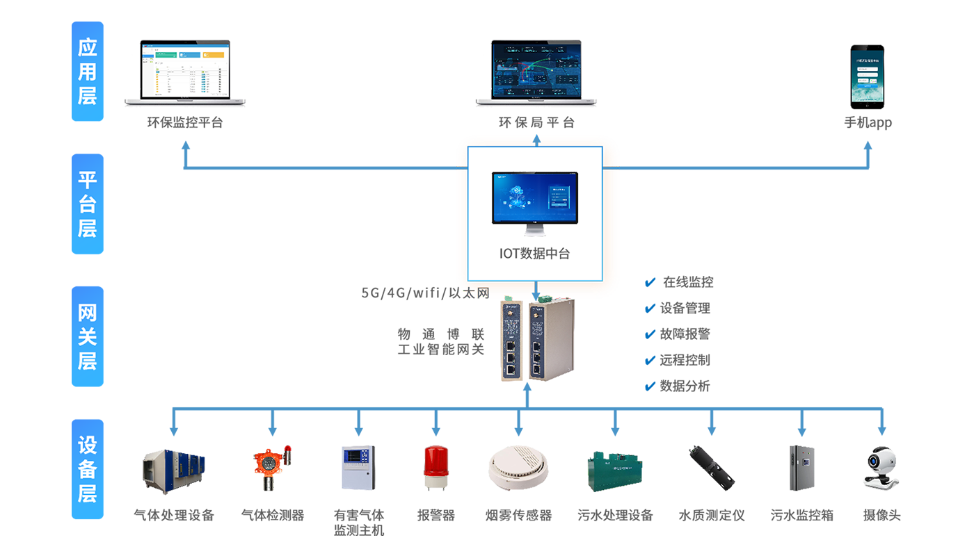 通过物通博联工业智能网关对生产的废水,废气、废料等污染源进行在线监测,采集工厂环保设备的运行数据、污染物排放数据,上传至环保监控云平台,通过平台管理人员能够实现实时监控、远程管理、预警报警、数据分析、远程控制等功能,帮助工厂实现环保管理的数字化、智能化。同时也可以按照要求发给环保平台,满足监管需求。
