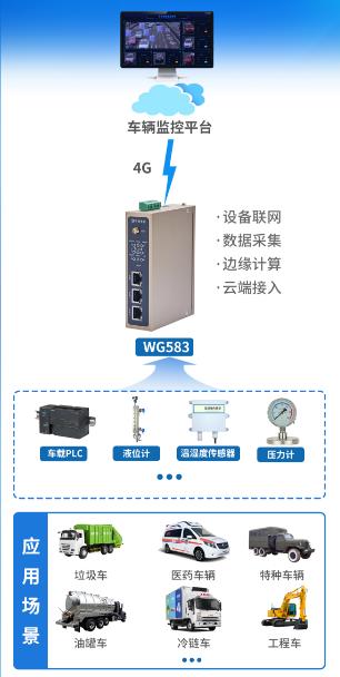 数据采集层:在排水抢险车上安装物通博联工业智能网关,该网关具备强大的数据采集能力,可接入车辆上的GPS??椤⒖刂破鱌LC、传感器、发电机组等设备,实时采集车辆的位置、速度、油耗、发动机状态、排水量等关键信息。