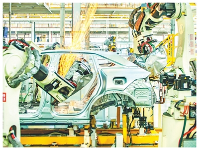 江苏南京一家汽车自动化生产车间内,机械臂灵活焊接新能源汽车。朱红生摄