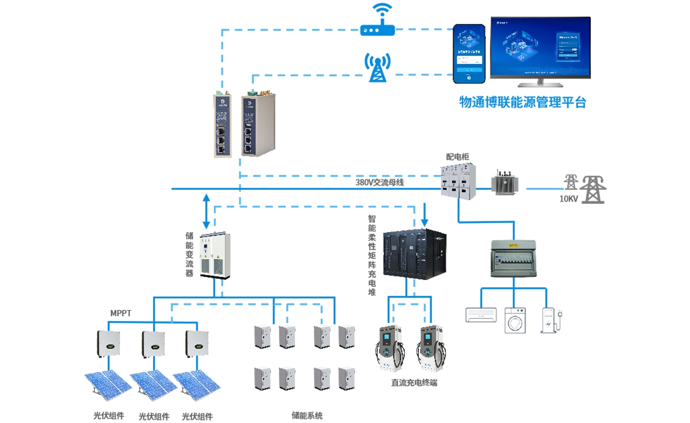 通过物通博联的能源网关,实时采集光伏发电、储能状态和充电需求等数据。将这些数据传输至光储充一体化监控平台(EMS),平台根据实时数据和负荷预测,优化光伏、储能和充电设备之间的能量调度,实现光伏储能协同工作,合理分配能源。在电网故障或紧急情况下,能够利用储能电池提供应急供电。