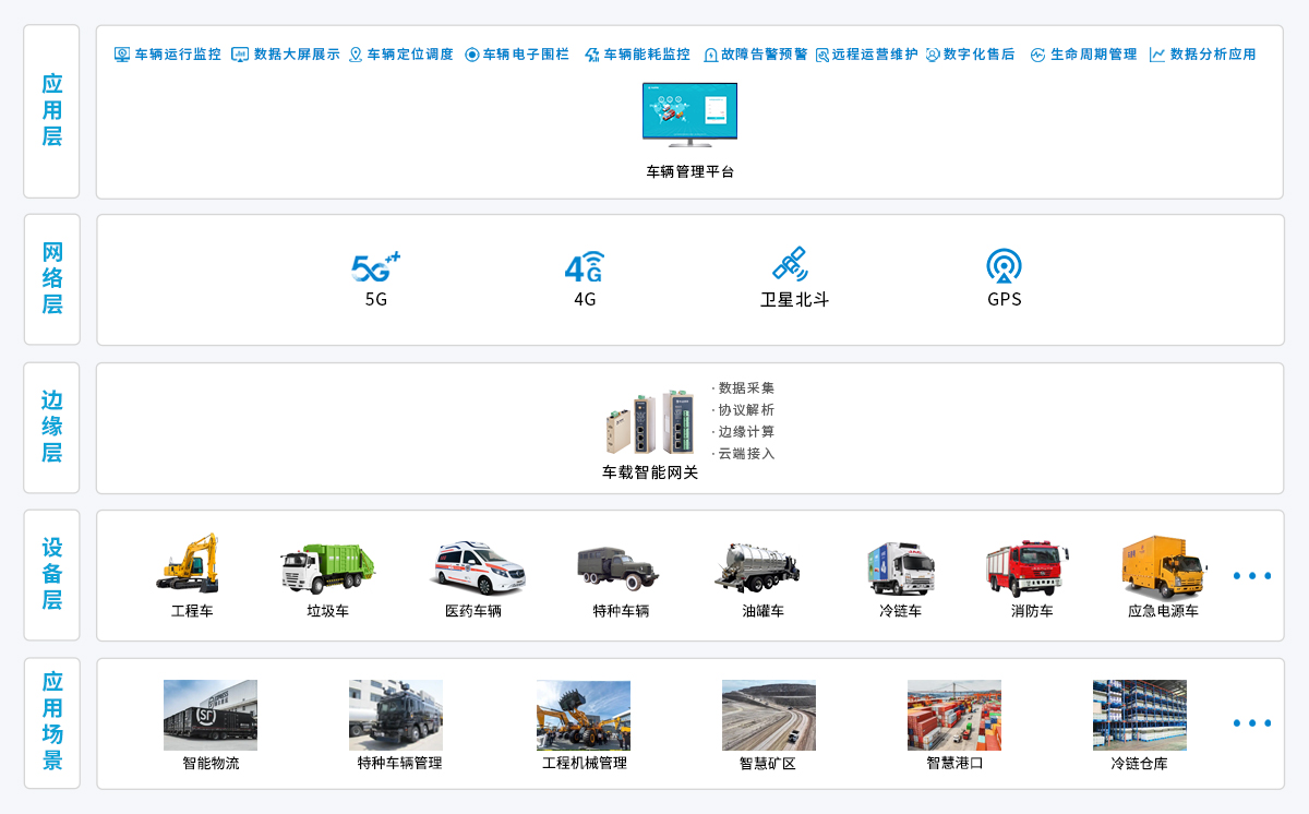 物通博联针对特种车辆数字化需求,以车载智能网关为核心,实时采集车辆行驶参数、动力系统状态、作业设备工况等关键数据,通过边缘侧本地化计算完成数据清洗、格式标准化处理。再依托 5G/4G 无线通信或北斗网络,将标准化数据上传至特种车辆管理平台。平台实现车辆位置实时追踪、运行状态远程监控、异常情况及时预警,为特种车辆高效调度与安全管理提供技术支撑。