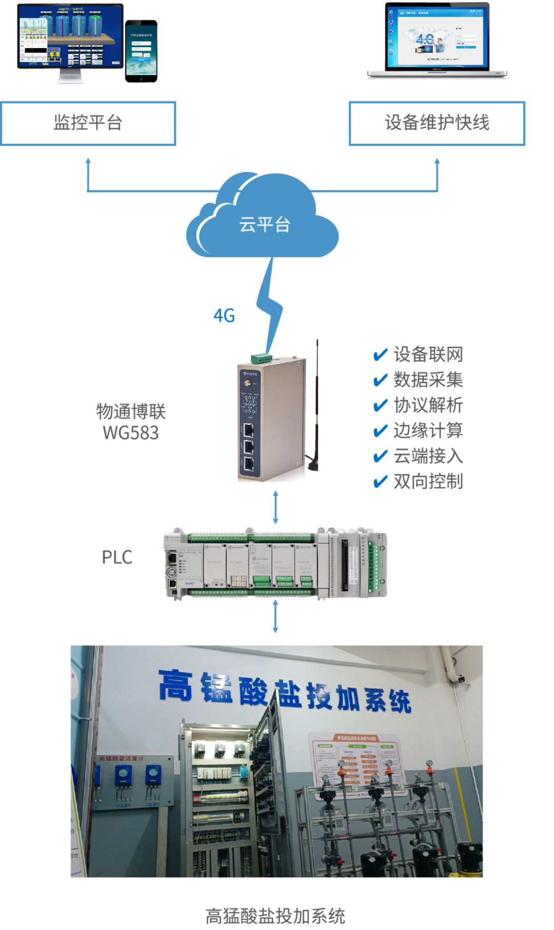 该自来水公司是一家致力于“供排水一体化、城乡水务一体化、投资建设运营一体化”的水务一体化运营企业。本次项目使用物通博联工业智能网关+IOT云平台搭建高锰酸盐投加设备物联网系统,旨在实现对自来水厂水务进行智慧管理,确保稳定高效运行。