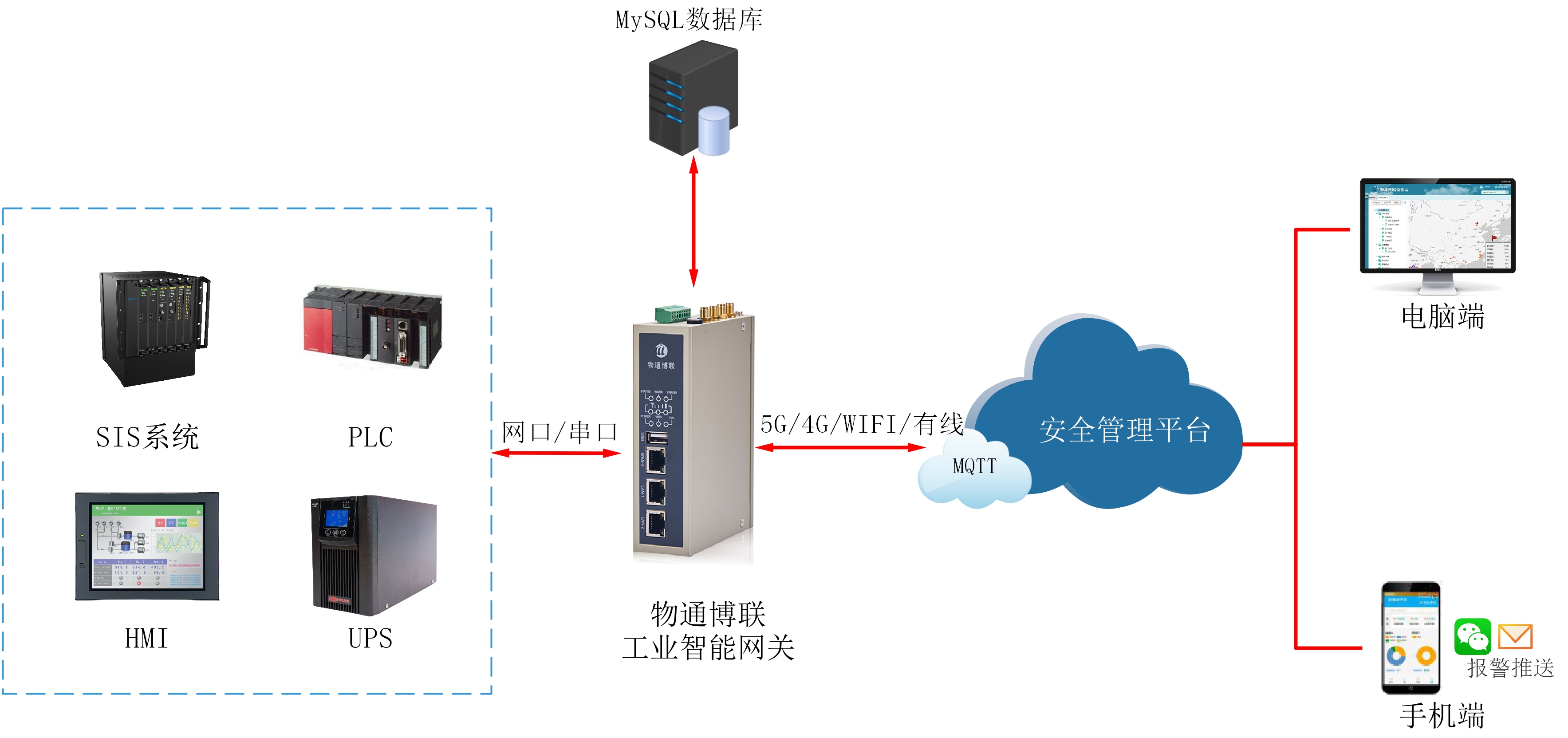 物通博联·工业智能网关支持接入控制器PLC、触摸屏HMI、UPS电源等设备,实时采集各生产工艺的压力、温度、液位、流量等数据以及阀门、开关、电源等运行状态,并通过5G/4G网络对接到工厂安全管理平台与MySQL数据库中,从而实现远程监控、故障告警、报表管理以及数据分析等功能,为工厂安全生产的精细化管理提供数智化,不断提高工作效率与管理水平。