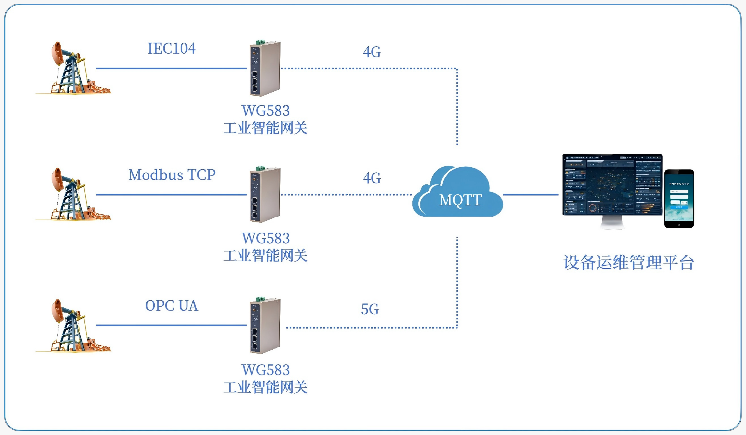 WG583网关支持边缘侧数据预处理,过滤无效数据并进行标准化转换,随后以5G/4G网络通过轻量级MQTT物联网协议进行数据对接到智慧油田管理平台中,通过多网互备、断网重连、断点续传、安全加密等多种功能,保障数据安全完整传输。